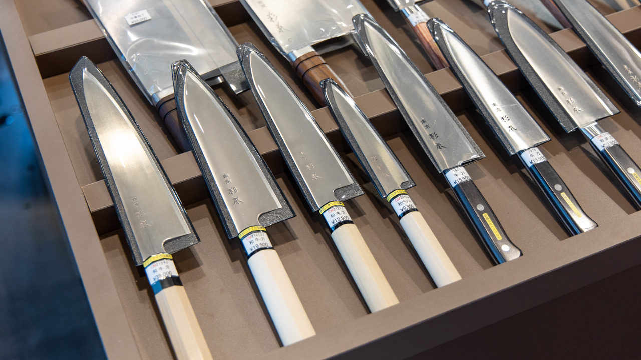 創業時と変わらぬ製法で生産している包丁がズラリと並びます。