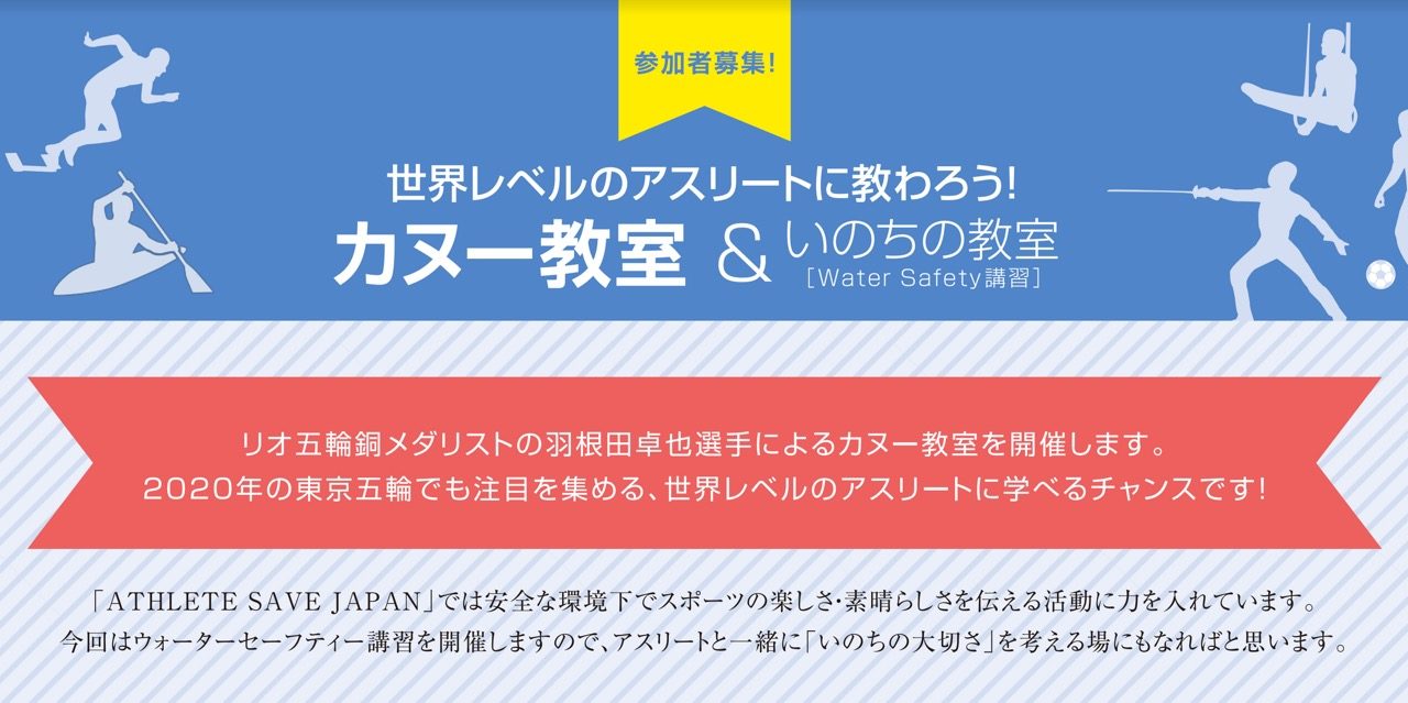 ATHLETE SAVE JAPANは2019年7月25日(木)に、「世界レベルのアスリートに教わろう!カヌー教室&いのちの教室 water safety講座」を開催します!場所は豊洲ぐるり公園の乗船場(東電堀)。