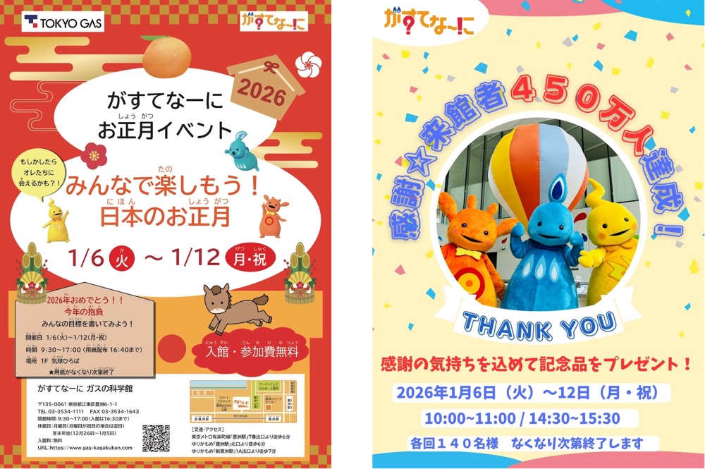 先日、来館者450万人を達成した豊洲の「がすてなーに ガスの科学館」が「お正月イベント ~みんなで楽しもう!日本のお正月~」を開催します!