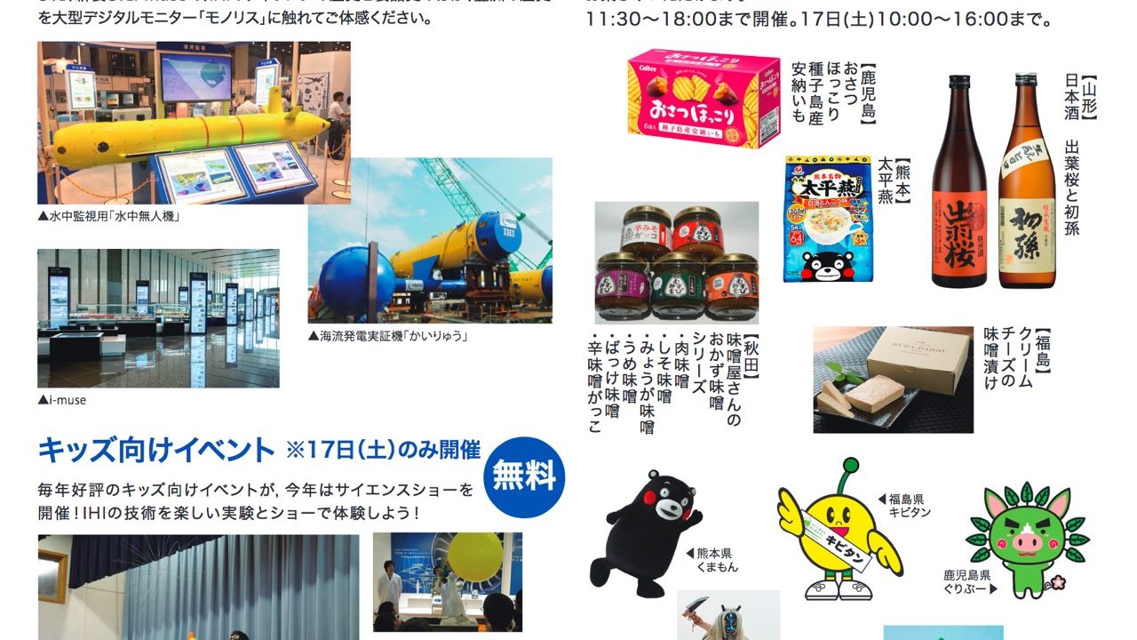 水中無人機や港湾監視システム、水中浮遊会式海流発電システムなどの製品・技術展示に加え、子ども向け企画を実施するほか、「ご当地名産マルシェ」では、IHIグループとゆかりのある秋田・山形・福島・熊本・鹿児島の各県の物産品の販売や観光地の紹介。さらに、くまモンをはじめとするご当地キャラクターが登場するステージなども予定されていますよ(^^)