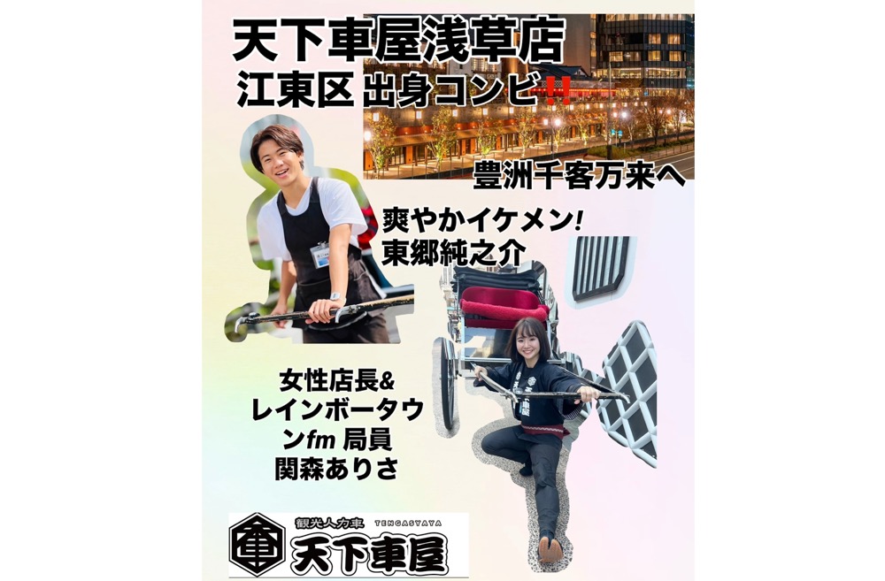 普段は浅草で人力車を引いている天下車屋ですが、なんと、店長で車夫の関森ありささんは江東区のコミュニティFMラジオ局「レインボータウンFM」の局員でもあるそうです!