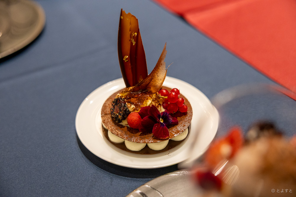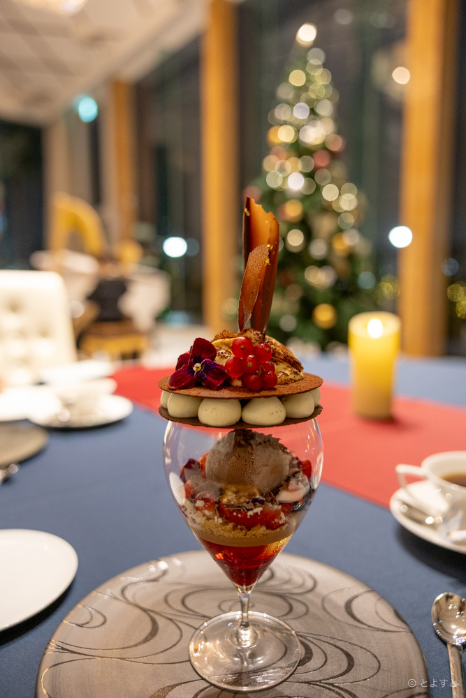 (当日は雨だったので外観は別日に撮っていた写真を載せておきます)今回の夜パフェはクリスマスバージョンです。クリスマスツリーが飾られた披露宴会場を使って生演奏も。