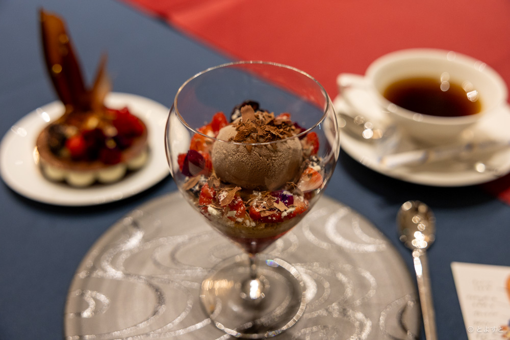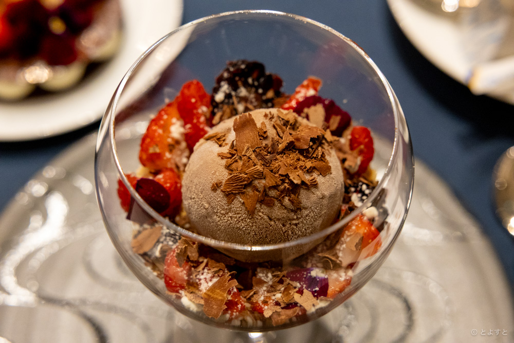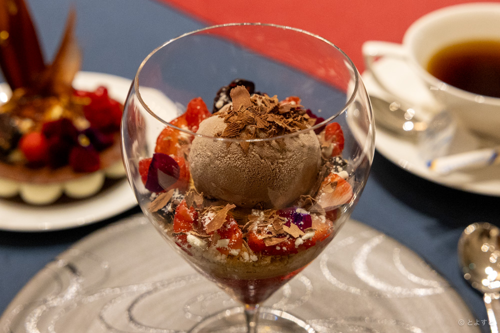 濃厚なチョコレートアイスにラズベリーとブラックベリーの酸味が良く、無限に食べられそうなバランスの良いパフェに仕上がっていて、幸せな時間が続きます。