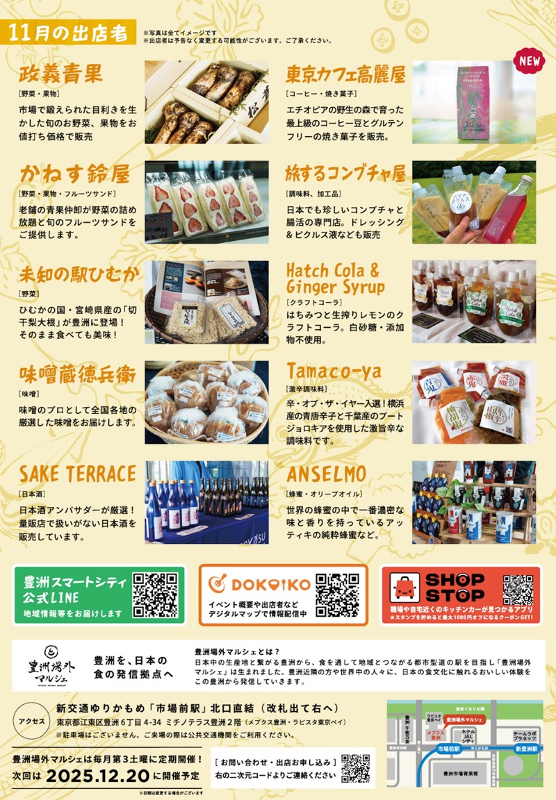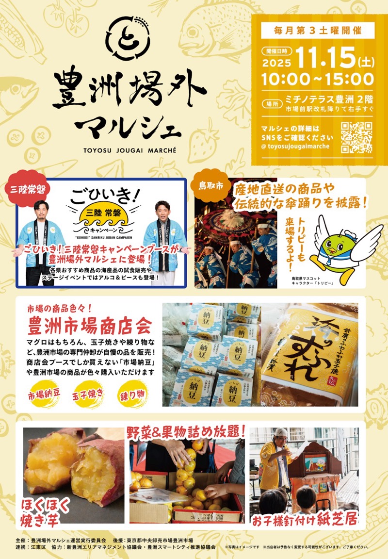 2025年11月15日(土)、豊洲市場のすぐ横で毎月恒例の「豊洲場外マルシェ」が開催となります!