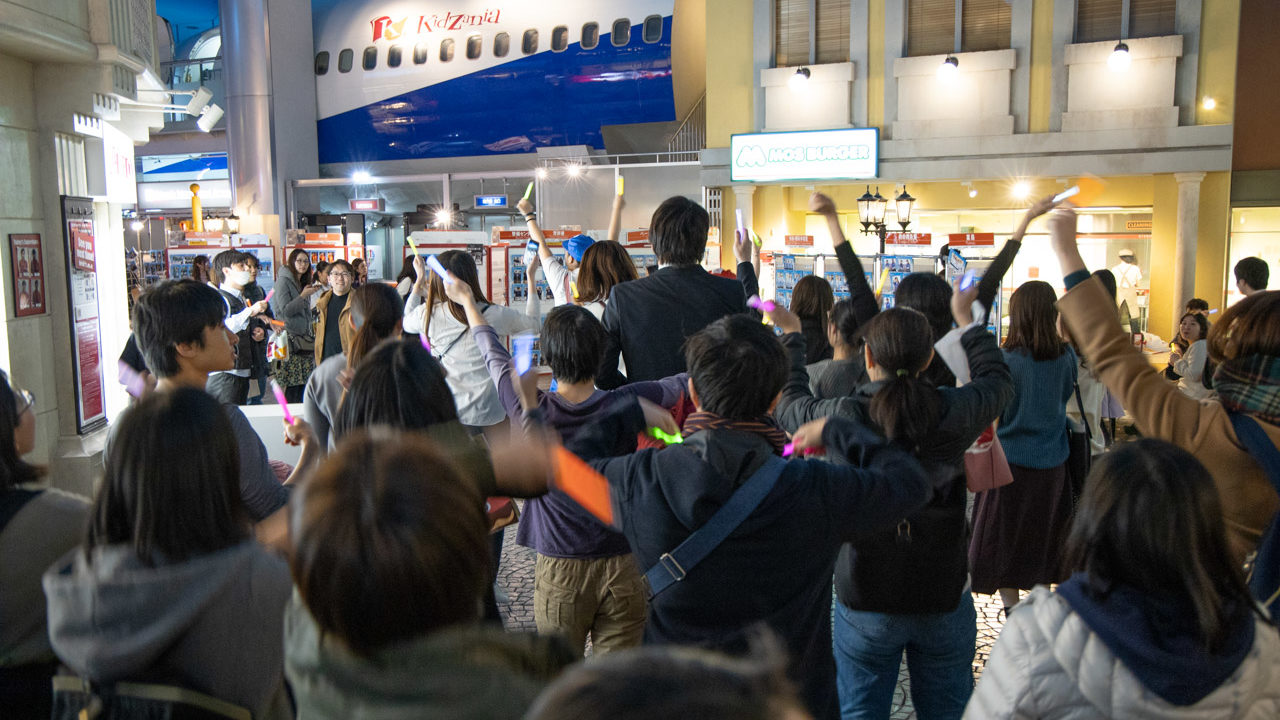 最後はグランドフィナーレ。配布されたサイリウムを持ってパレードです。参加者がみんなでキッザニアのなかをぐるぐる巡りながらダンスし、とても盛り上がりました。これは楽しいですね〜!