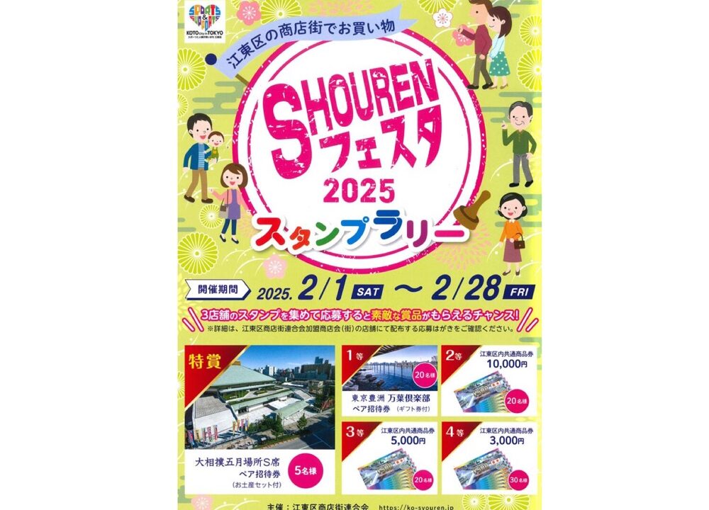 江東区商店街連合会は区内の商店街で買い物・食事をすると、抽選でプレゼントが当たる「SHOURENフェスタ2025スタンプラリー」を2025年2月28日(金)まで実施しています。