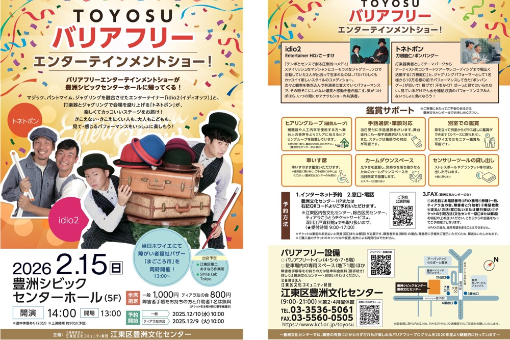 江東区文化コミュニティ財団 豊洲文化センターは「TOYOSUバリアフリー エンターテインメントショー!」を開催します。