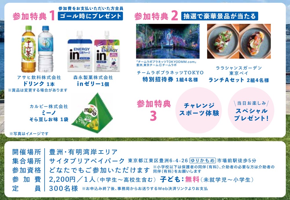 ゴール時に貰える参加特典や、抽選での豪華景品、さらには、ウォーキングコース内でもさまざまな特典が貰えるみたい!
