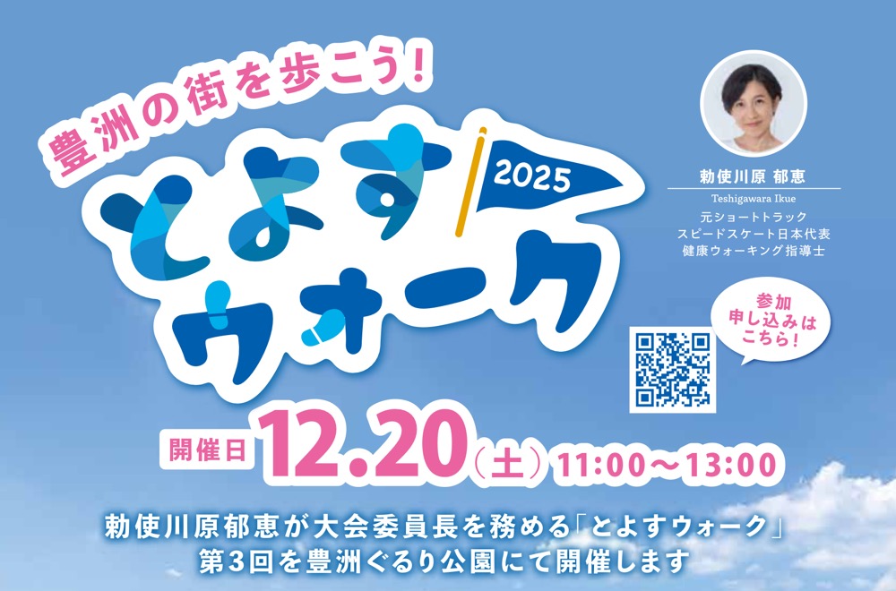 元ショートトラックスピードスケート日本代表で、現在は健康ウォーキング指導士である勅使川原郁恵さんが大会委員長を務める「第3回とよすウォーク」が開催となります。