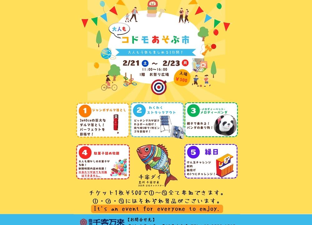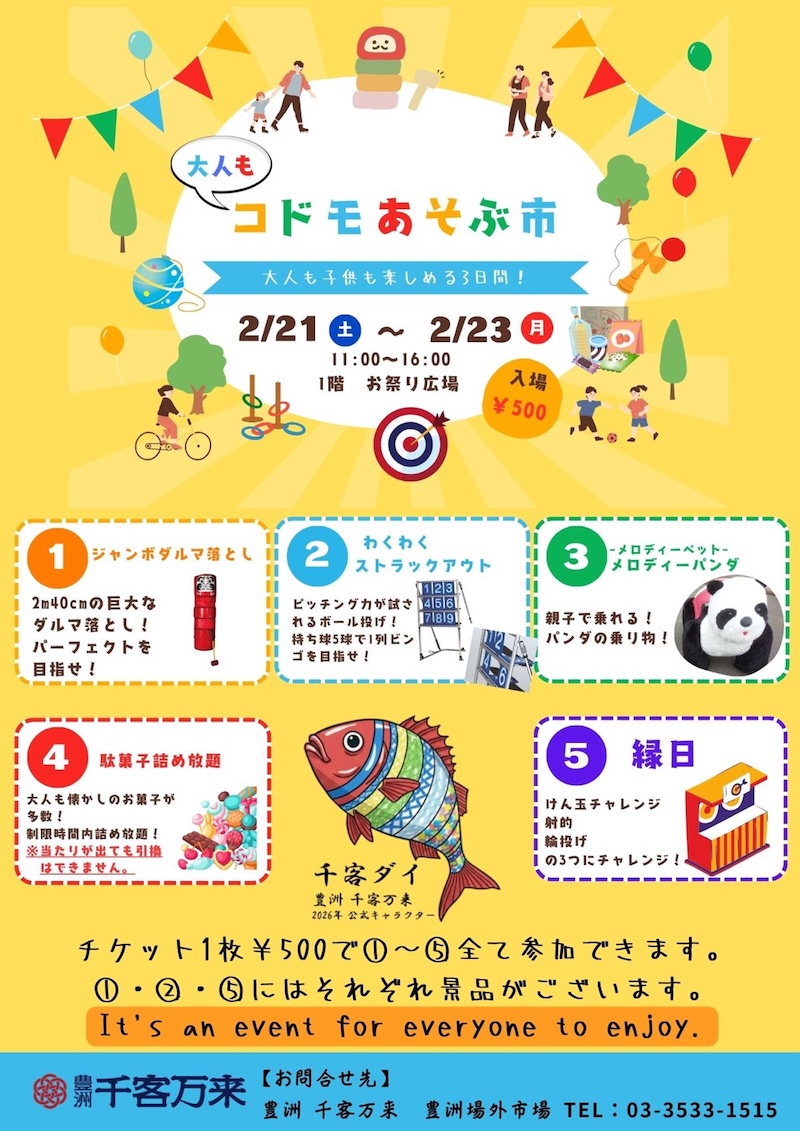 豊洲市場の観光施設「豊洲 千客万来」で2026年2月21日(土)〜23日(月・祝)の三日間、「コドモあそぶ市」が開催となります!