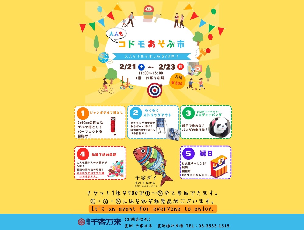 豊洲市場の観光施設「豊洲 千客万来」で2026年2月21日(土)〜23日(月・祝)の三日間、「コドモあそぶ市」が開催となります!