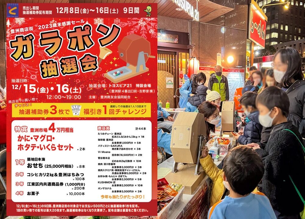 毎年恒例のお楽しみ、豊洲商友会協同組合が主催する「豊洲商店街 2023歳末感謝セール ガラポン抽選会」が開催されます。