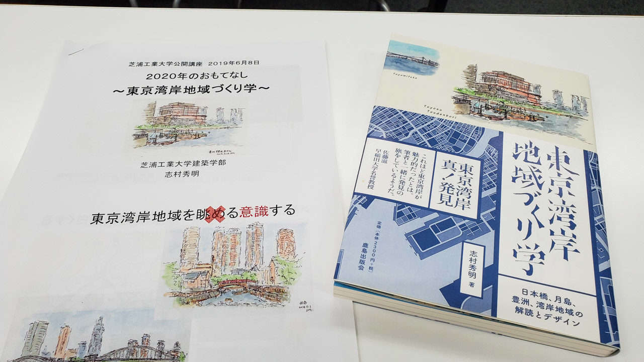 今回、2019年6月8日に行われた芝浦工業大学の公開講座では、志村先生がご自身の著書「東京湾岸地域づくり学」をテキストとし、数々のスライド資料を用いながら、まるでNHK「ブラタモリ」のような魅力ある楽しい授業をしてくださいました。
