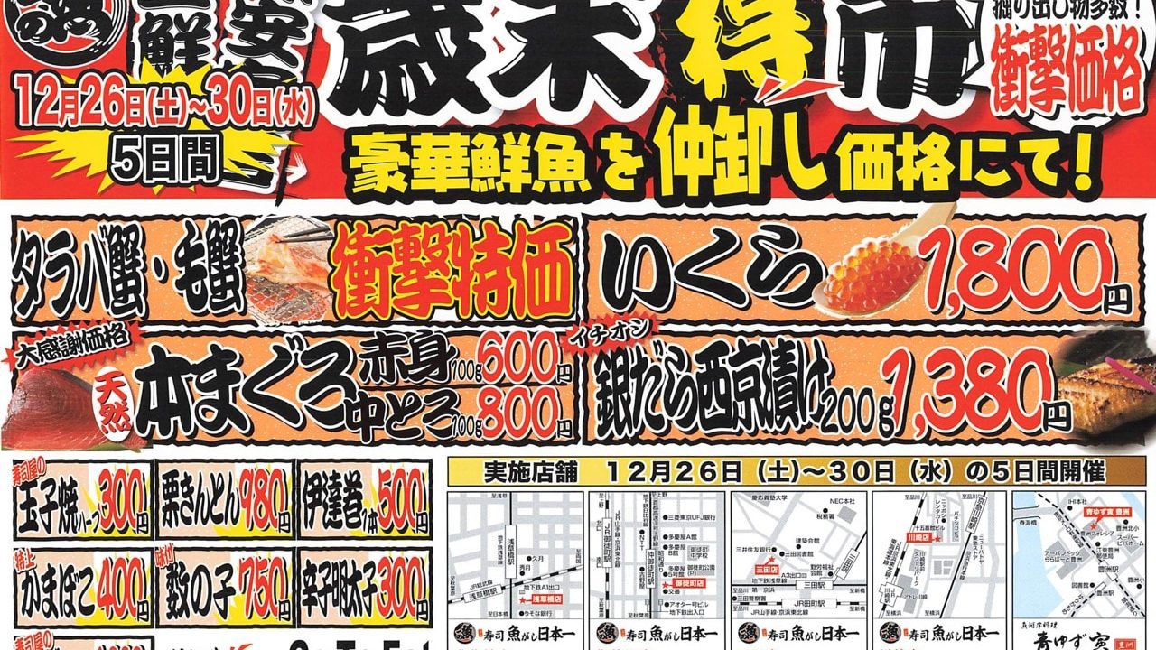 豊洲フォレシアの1階にある魚河岸料理店「青ゆず寅 豊洲」は2020年12月26日(土)〜30日(水)までの5日間、“歳末まる得市”を開催します!