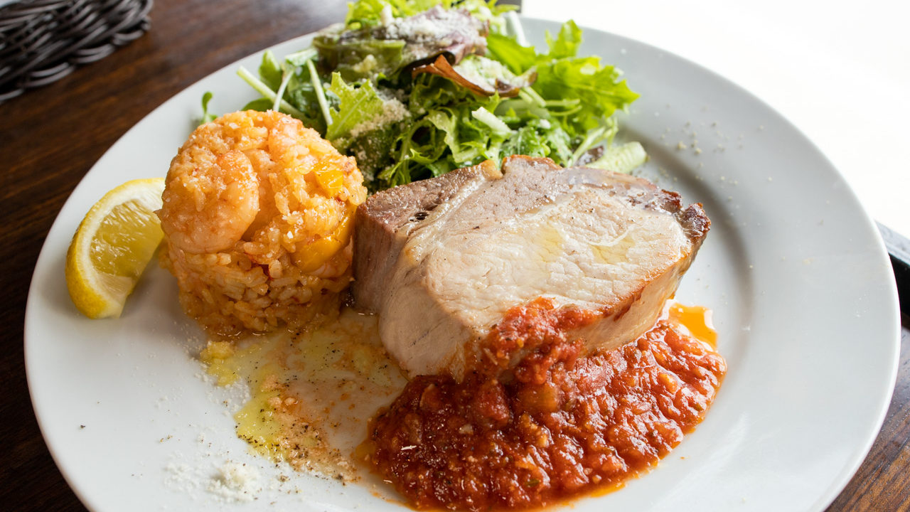 好きな人も多いエビのパエリアは深みのある味わいで、ランチだとローストポークとパエリアがわずか1,200円で一緒にいただけるのだから間違いなく最高コンビです。