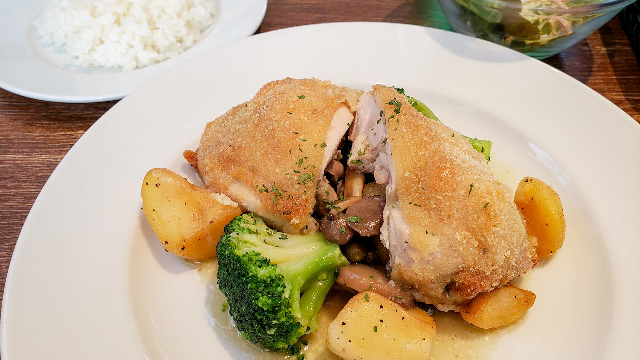オープンでこんがり焼かれた薄めの衣にナイフを入れると、パリッ♪良い音がするんだこれが。中からは肉汁が出てきてジューシーです。