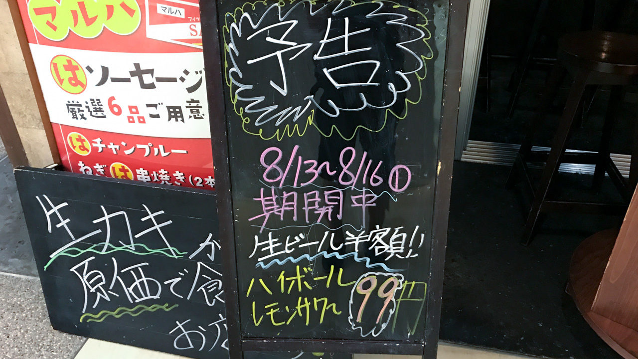 今回のビール半額&ハイボール99円のキャンペーンは、お盆休みでお客さんが少ない期間にどうにかお客さんを呼ぼうという作戦なのでしょうね。