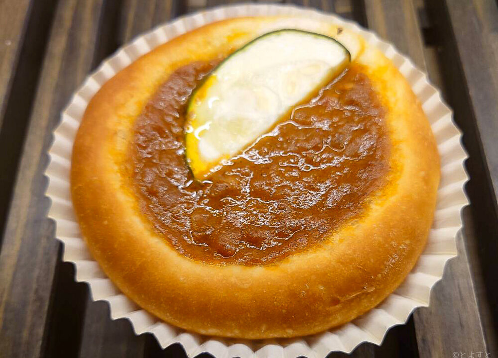 海老が入り、トマトクリームのアクセントが効いたカレールウと、上に乗ったズッキーニが斬新な海老のトマトクリームシーフードカレーパン。