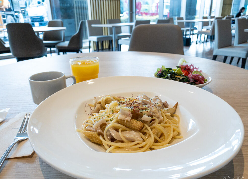 この日のメイン料理は、日替わりメニューになっていたパスタ(ヤングコーンとれんこんのガーリックソースパスタ)を選択しました。