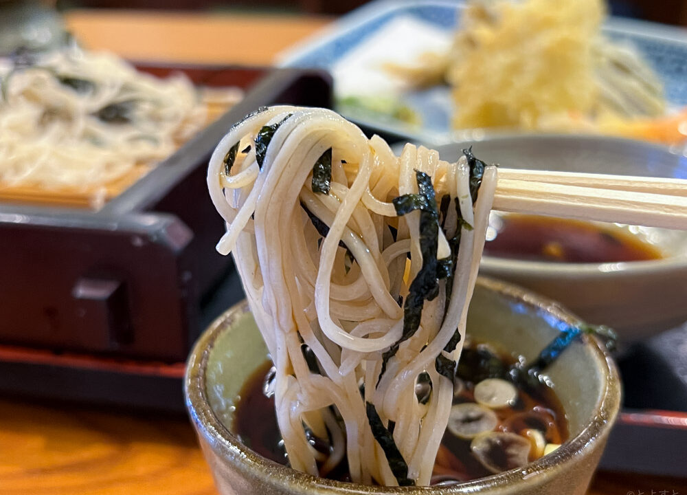 蕎麦は程良いコシがあってツルッと食べやすい麺に、出汁の効いた濃いめのつゆ。