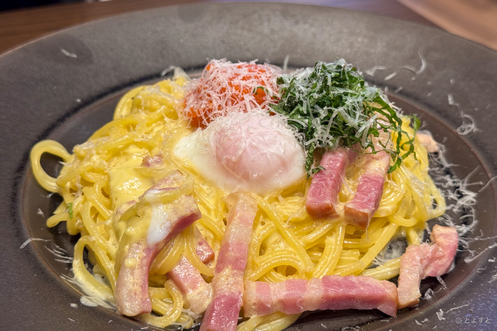 明太カルボナーラ 半熟卵添え家族がオーダーした「明太カルボナーラ 半熟卵添え」も、めっちゃ旨い!と喜んでおりました。