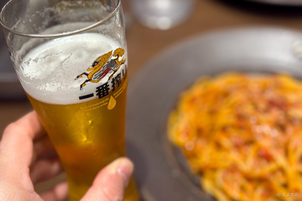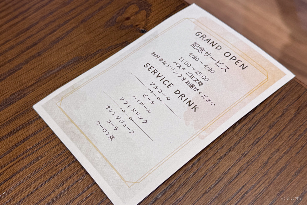 4月30日(木)までの期間限定で15時までのランチタイムにスパゲティを注文すると、ドリンク1杯無料。なんと、ビールもOKです!