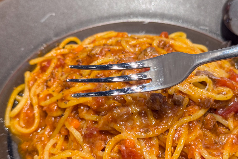 (そらのボロネーゼ・大盛り)お皿のデザインや、フォークの形もおしゃれですね。