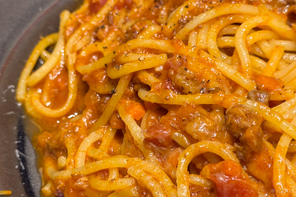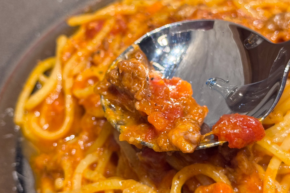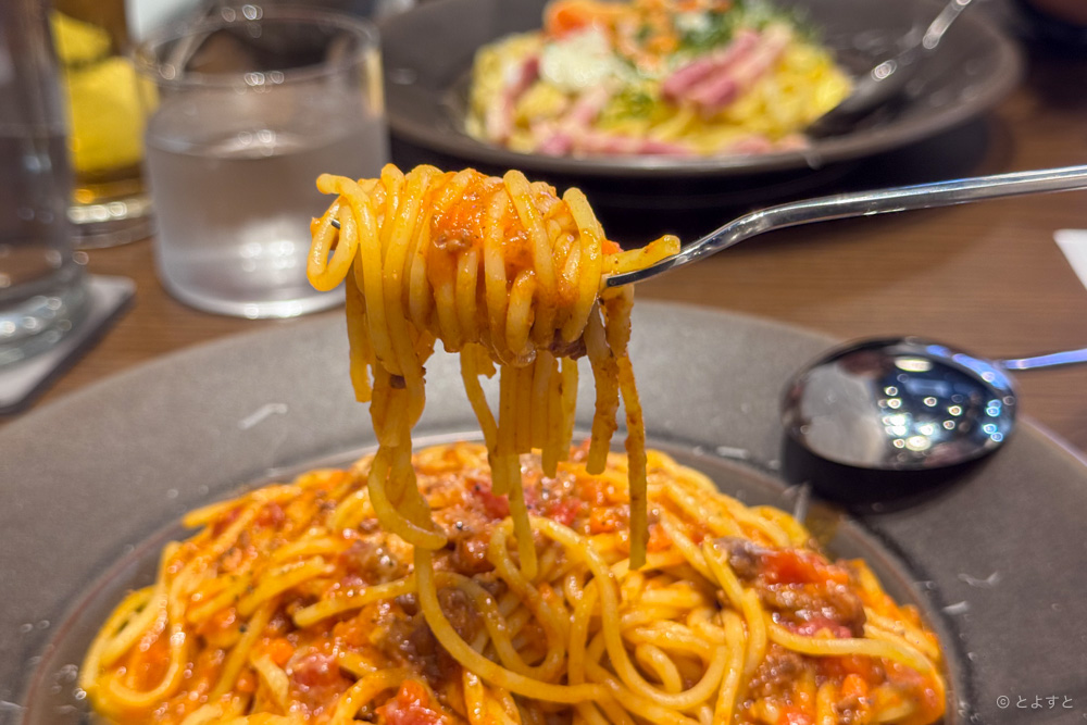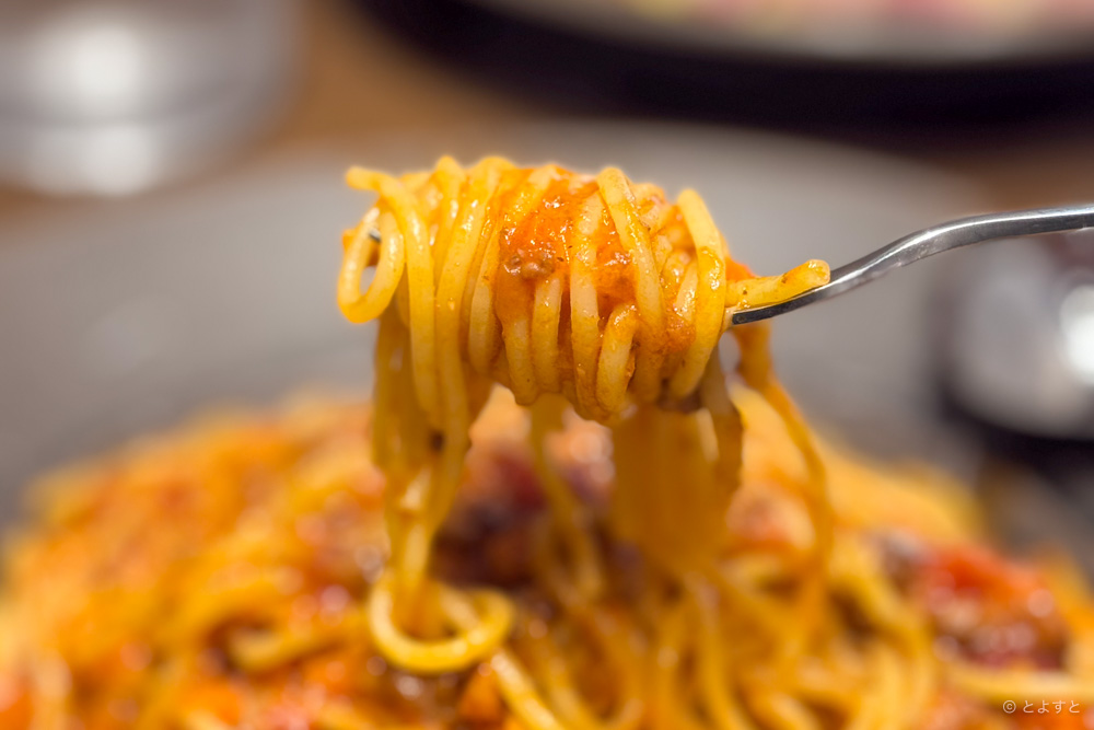 スパゲティの麺はもちもちしているのに生麺ほどの柔らかさはなく、しっかりとコシがある。