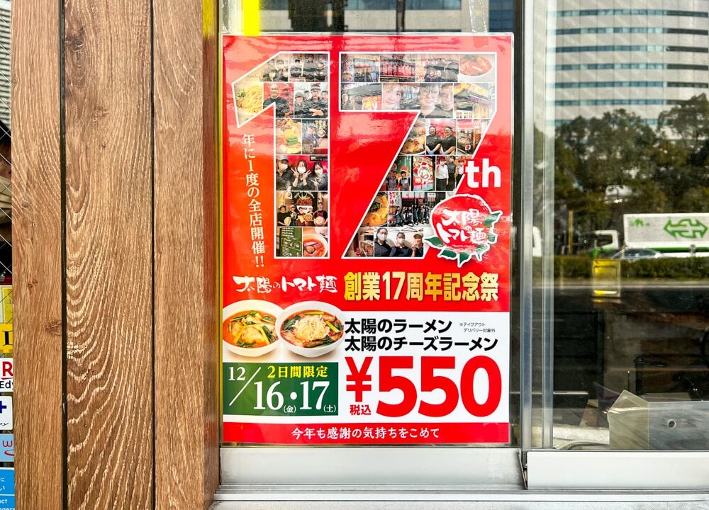 12月14日に太陽のトマト麺 豊洲店の前を通りかかった際に、入口に貼られたポスターがこちら。