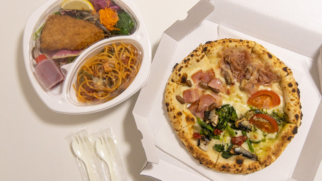 この日はお惣菜がたっぷり入ったお弁当と、店内のピザ窯で焼いたピッツァをオーダー。