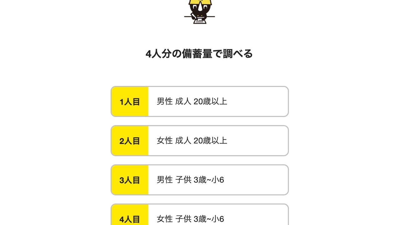 (「東京備蓄ナビ」)何人くらしなのか、それぞれの性別と年齢、戸建てか集合住宅か、ペットの有無といった質問に答えるだけ。