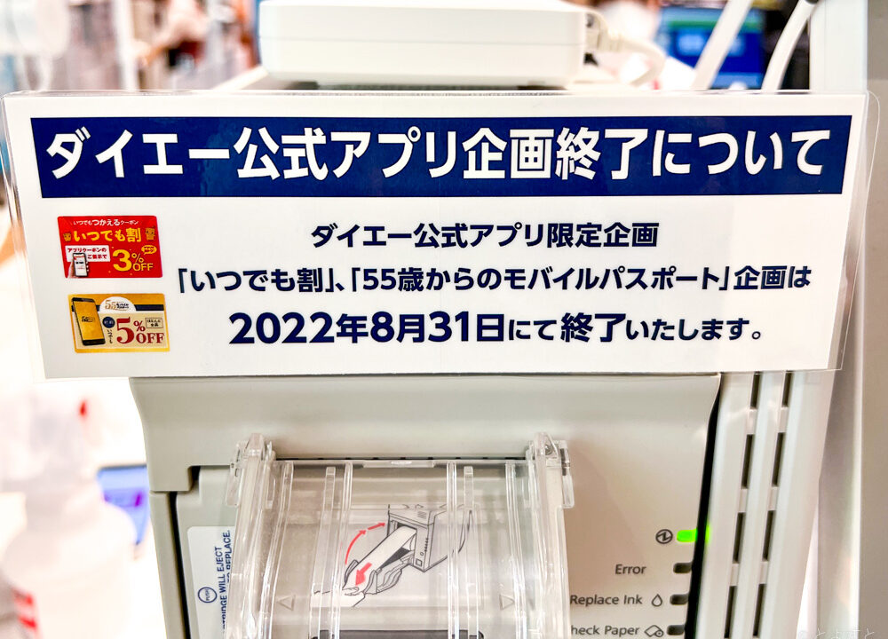 ダイエー豊洲店はダイエー公式のスマホアプリで提供していたクーポンについて、買い物金額が3%オフになる「いつでも割」と、5%オフになる「55歳からのモバイルパスポート」を、それぞれ2022年8月31日(水)をもって終了します。