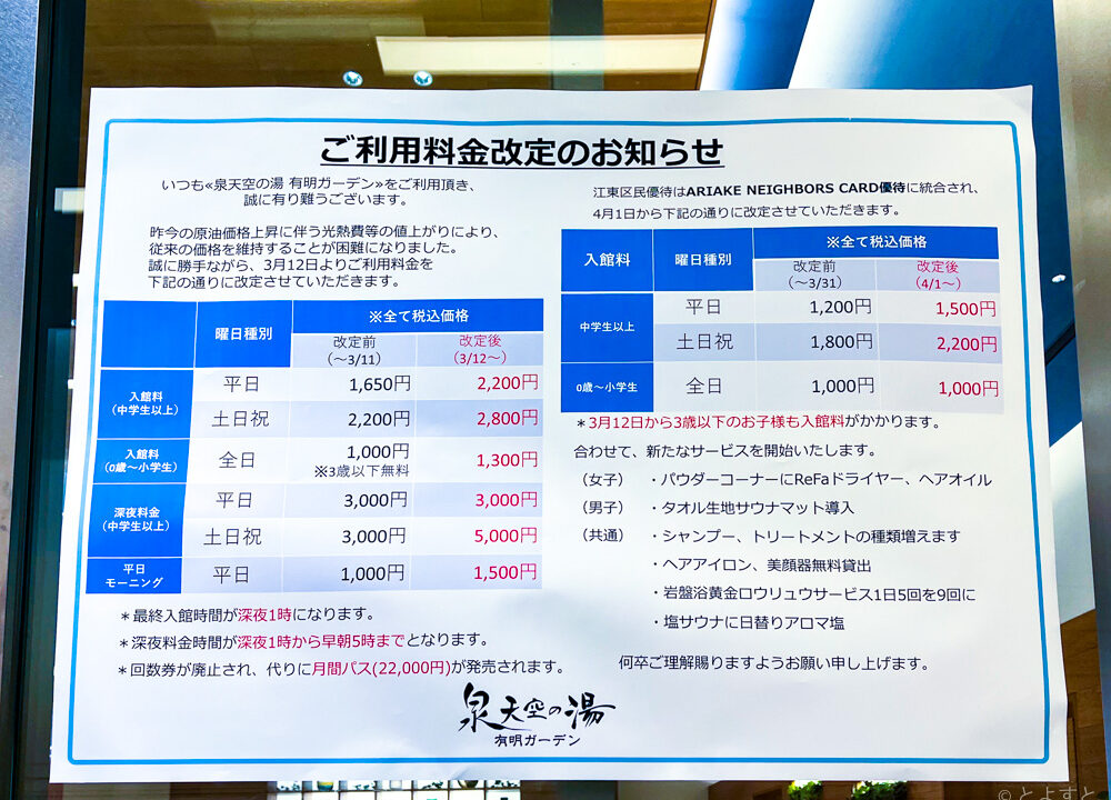 泉天空の湯 有明ガーデン 3月12日からの新料金