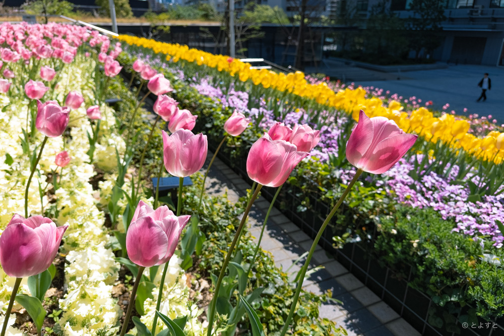 芝浦工業大学 豊洲キャンパスの大階段に設置されたフラワーガーデンでは、今まさにチューリップが見頃を迎えています!