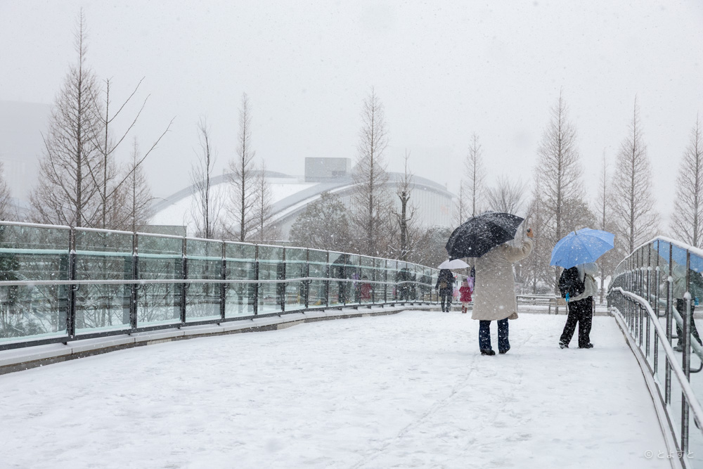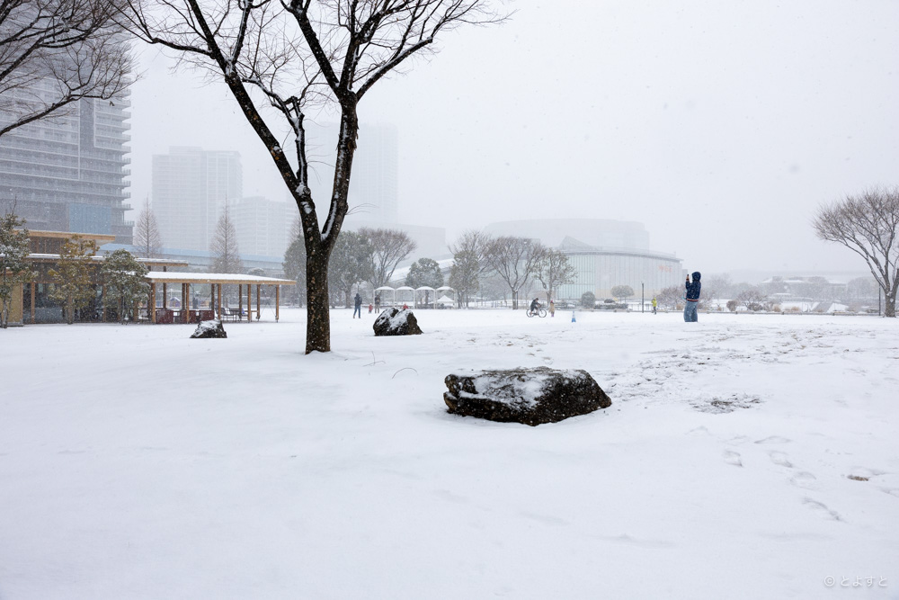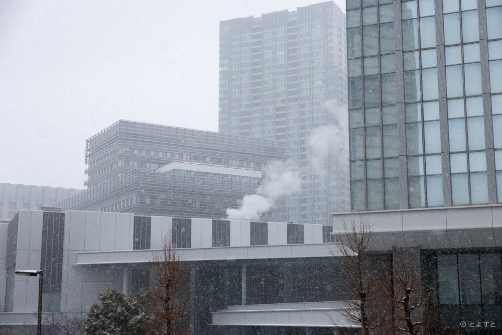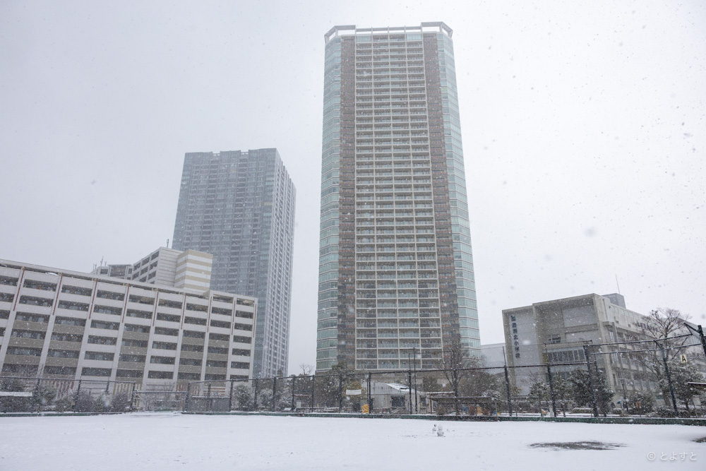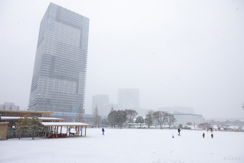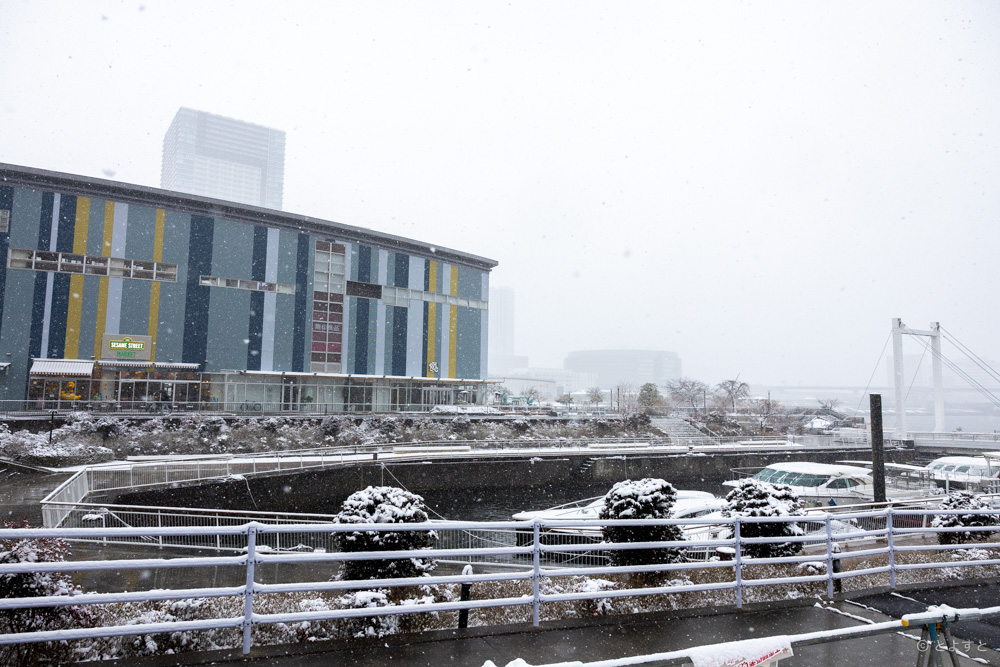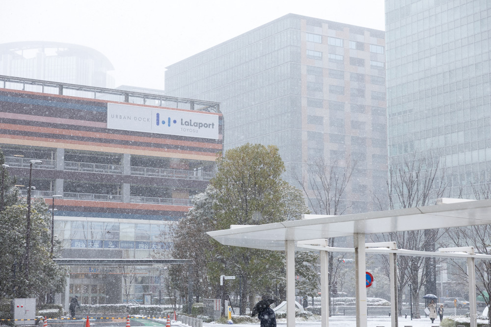 2026年2月8日(日)、前日から断続的に降り続いている雪の影響で豊洲は真っ白な世界に。