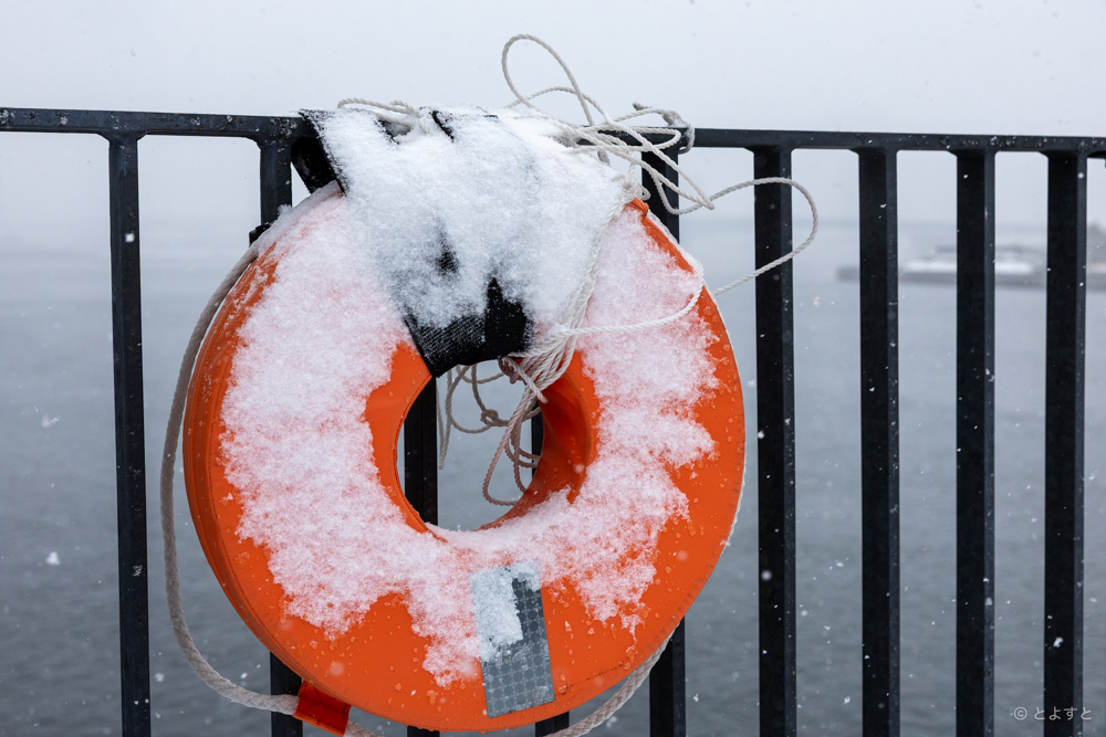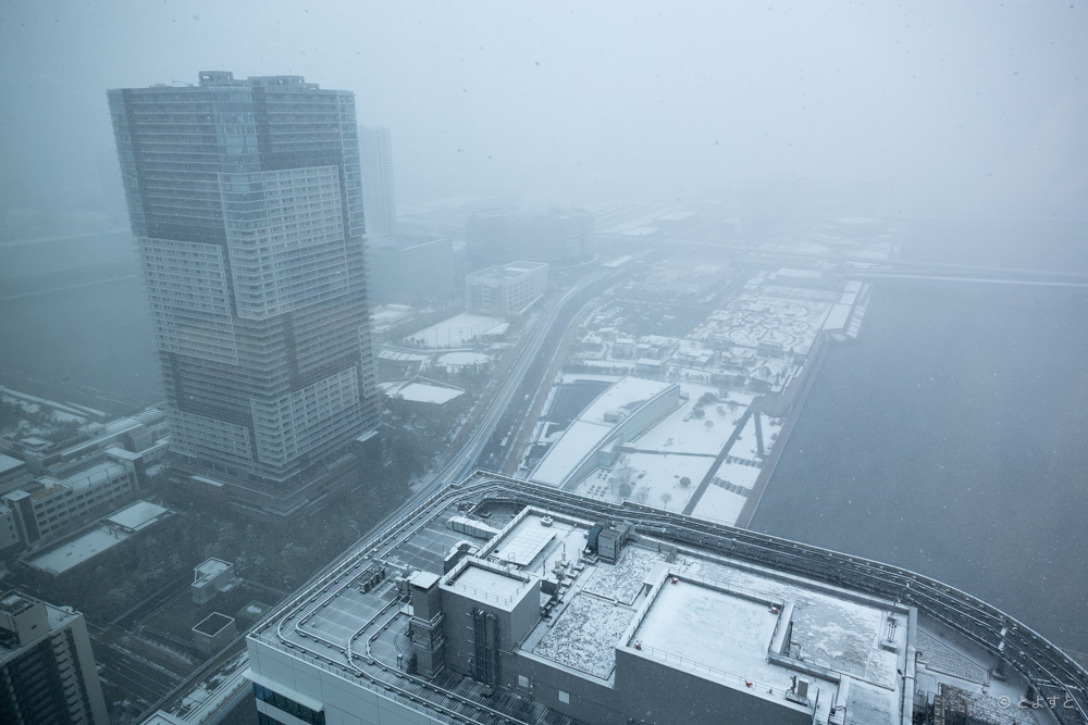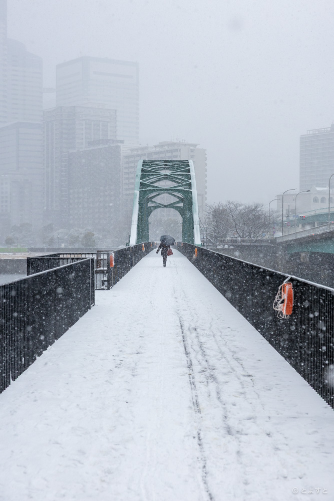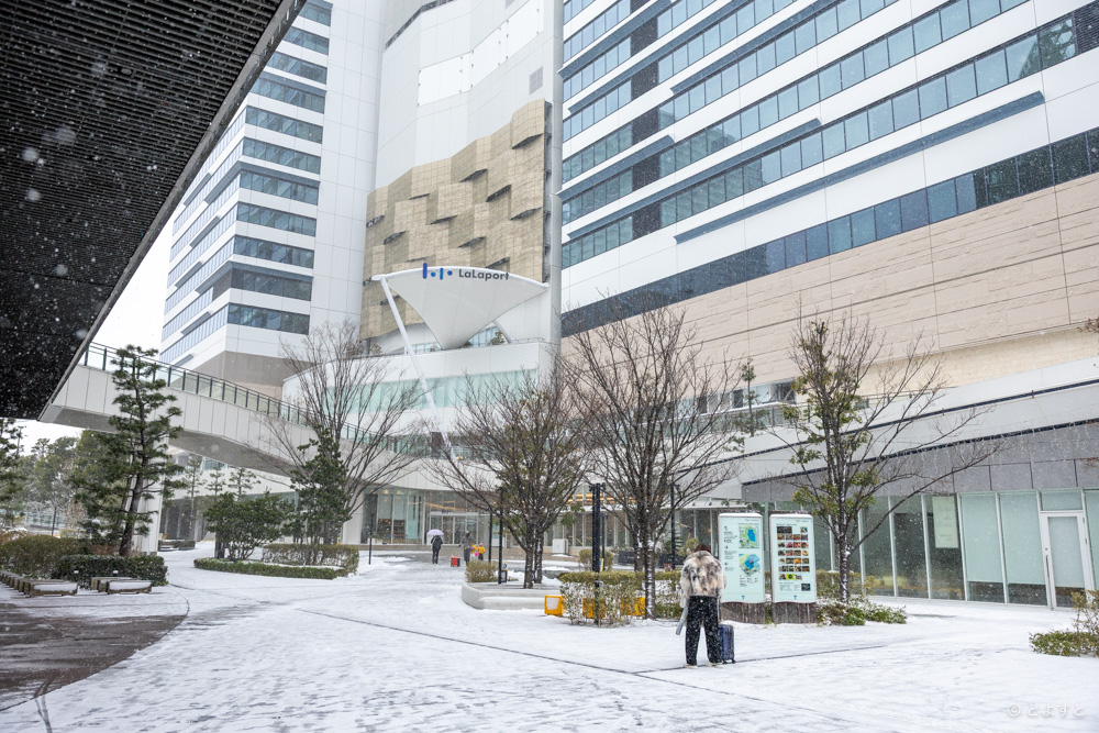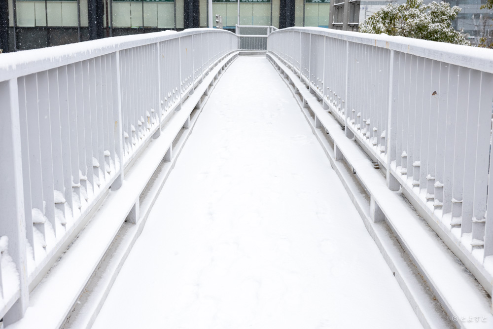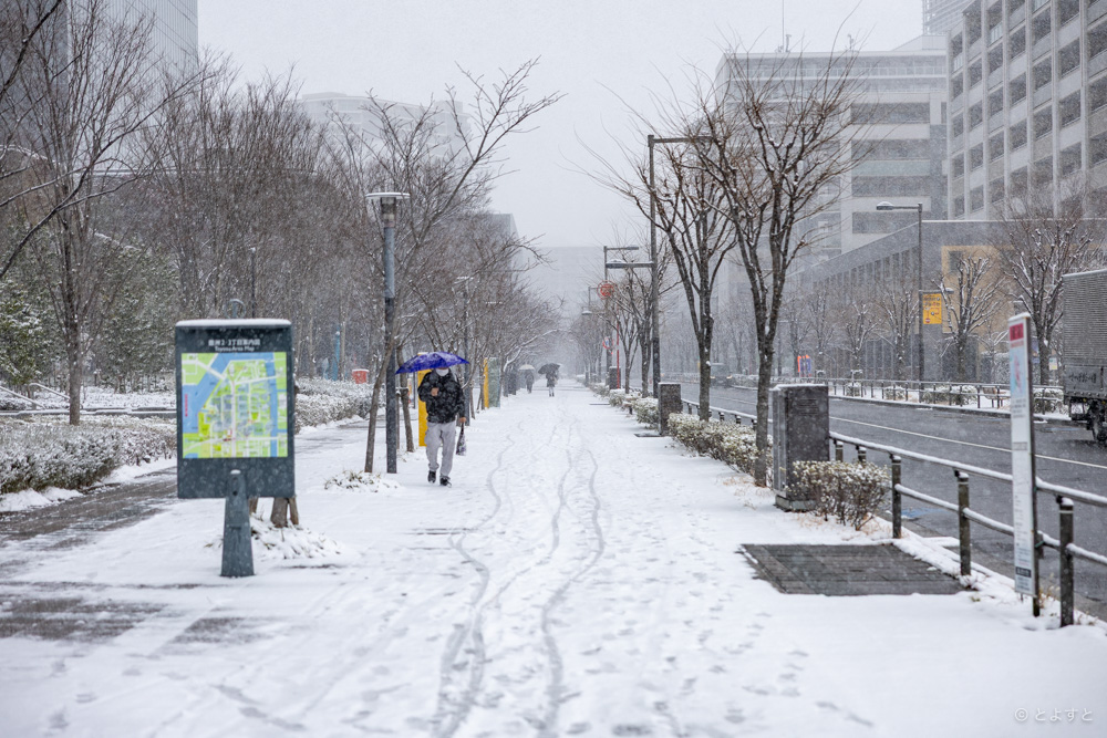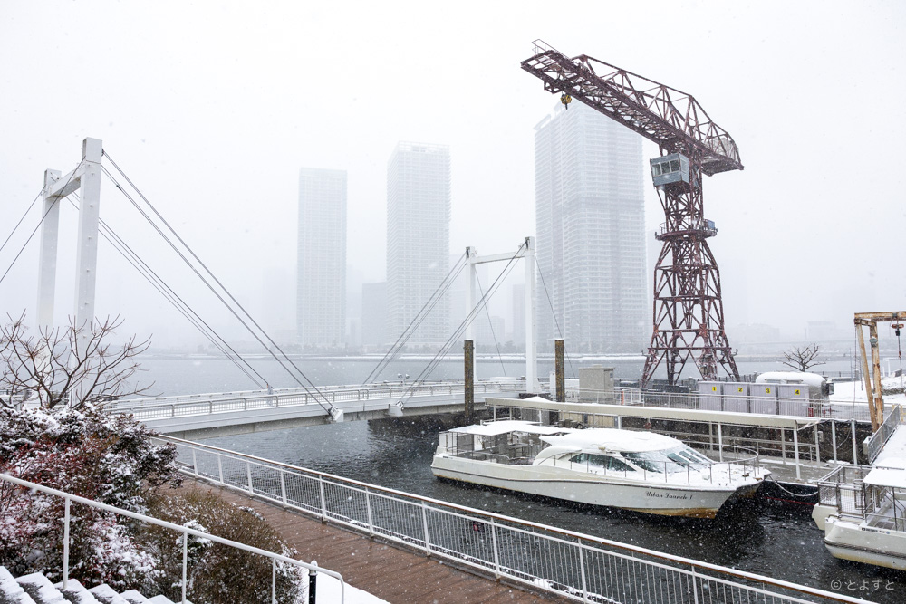 2026年2月8日(日)、前日から断続的に降り続いている雪の影響で豊洲は真っ白な世界に。