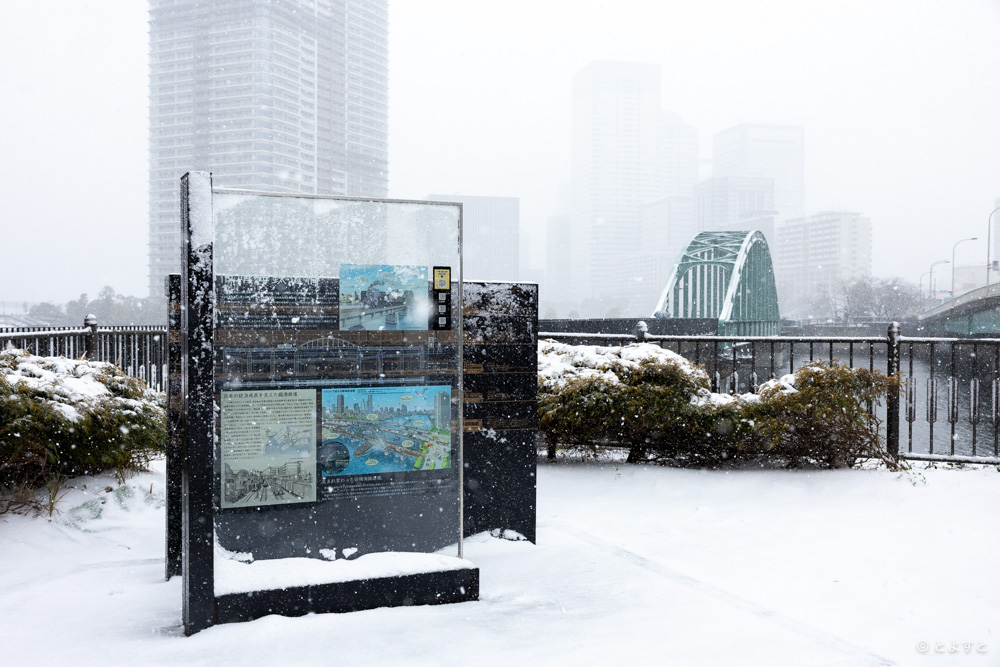 雪がパラパラと降るなか、豊洲のあちこちを巡って積雪のようすを見てきました。