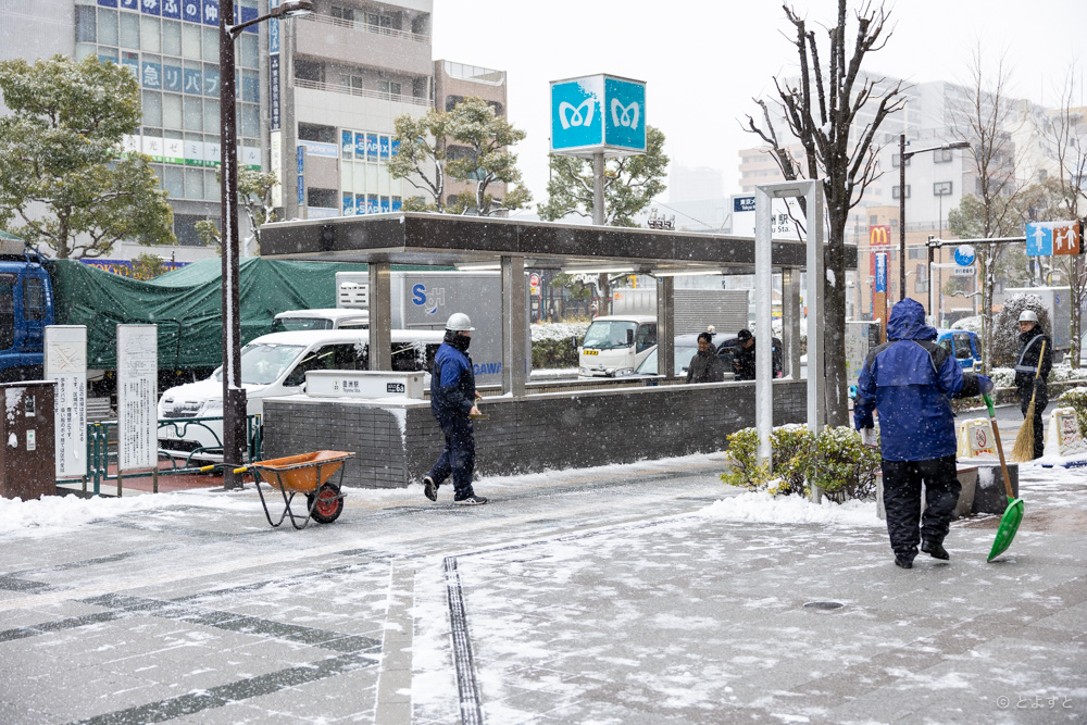 豊洲駅前では雪かきされてる方々も。ありがとうございます!