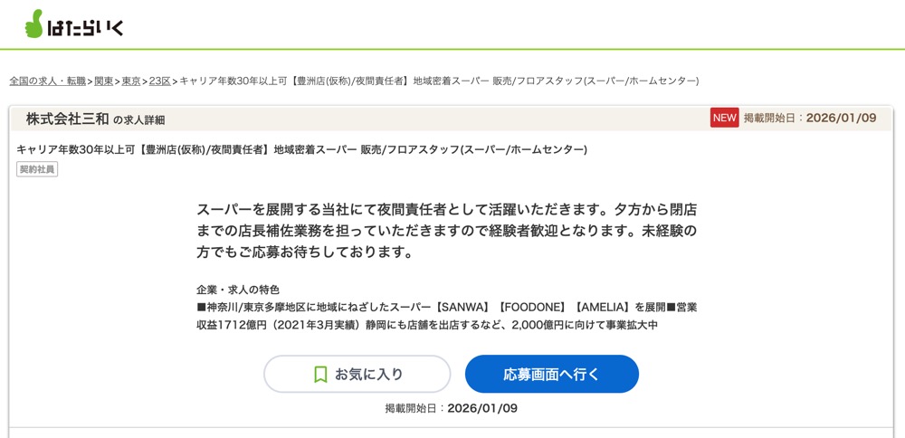 情報の出所は2026年1月9日にアップされた求人情報から。はたらいくリクナビNEXTなど複数の求人サイトが掲載。
