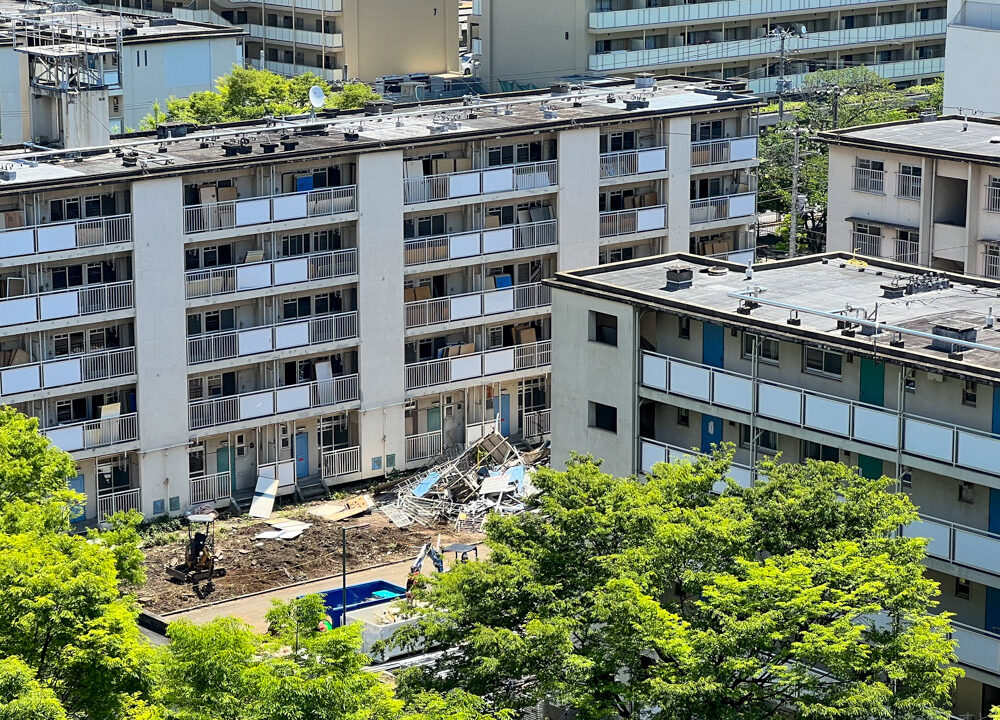 築50年を過ぎた都営豊洲四丁目アパートは建て替えが行われ、全13号棟のうち7棟はすでに解体済みです。