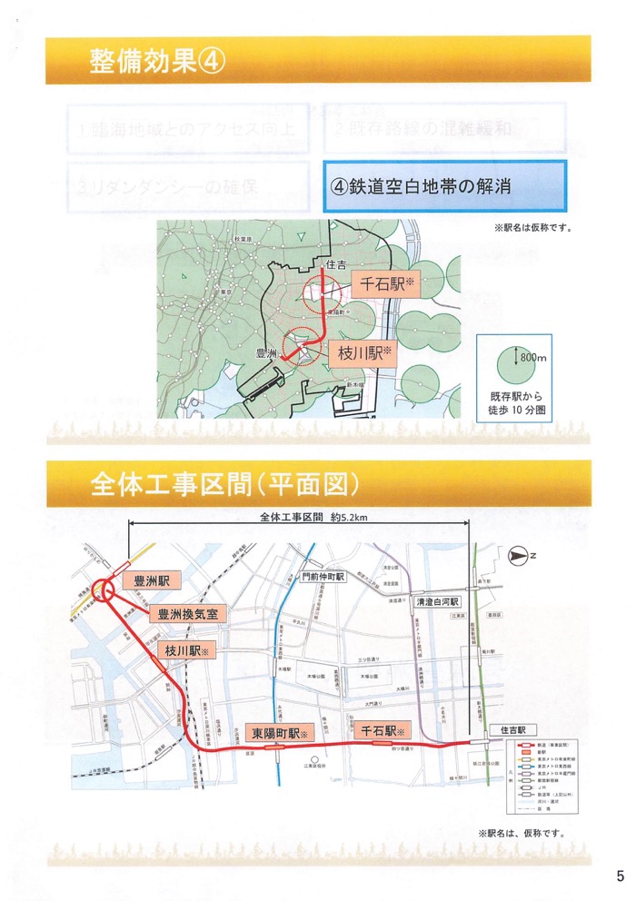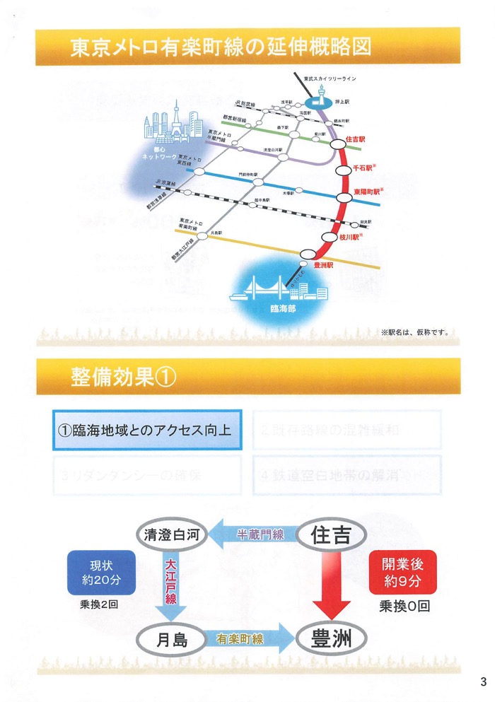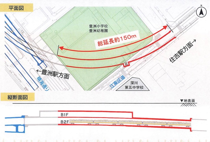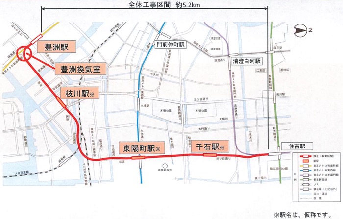 豊洲~住吉間では、新たに豊洲~東陽町と東陽町~住吉間に「枝川駅」「千石駅」(※いずれも仮称)の2つの中間新駅を設置予定。 路線延長は約4.8km、総建設費は約2690億円とされています。(うち一部を国・都、江東区が負担))