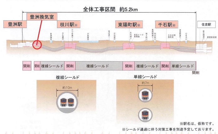 現時点でわかっていることは、すぐお隣に誕生する枝川駅(仮)など新駅は地上から地中を掘っていく開削工法で作りますが、駅と駅との間の列車が通るトンネルはシールドマシンを使ったシールド工法で地中を水平方向に掘りながら作ります。