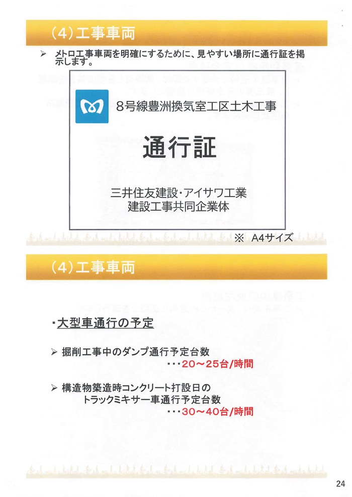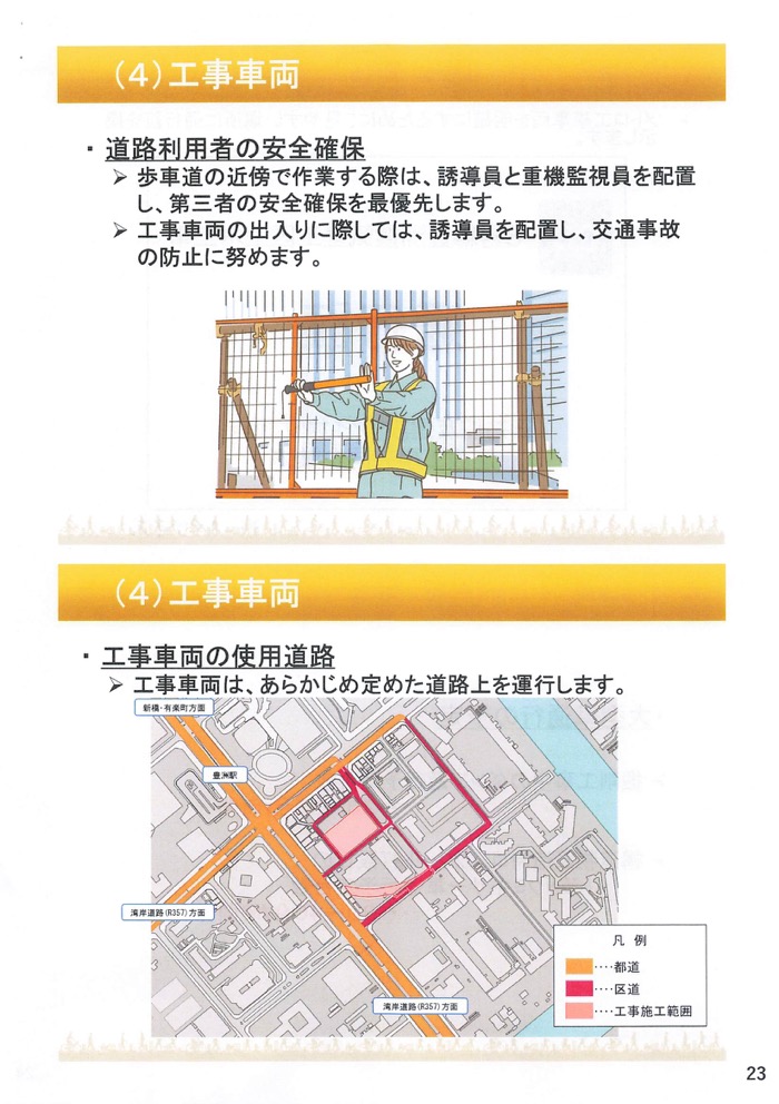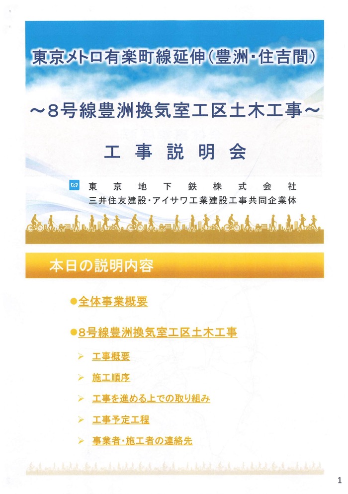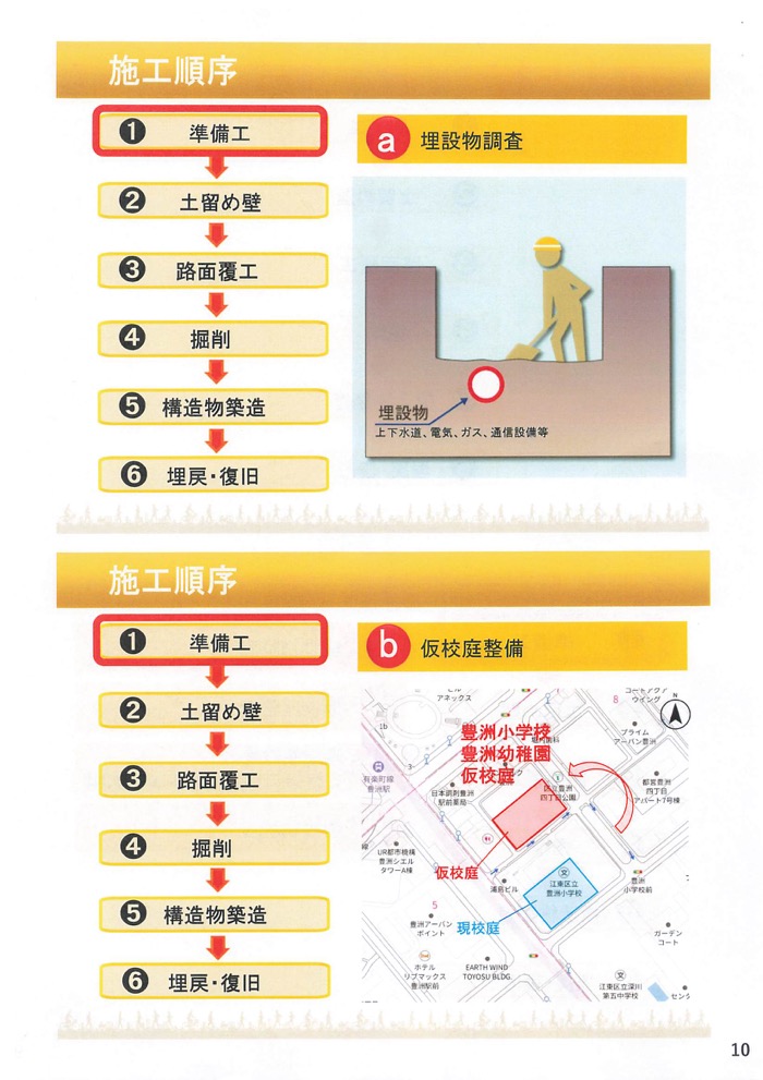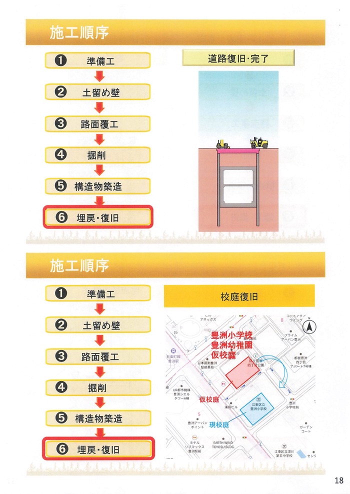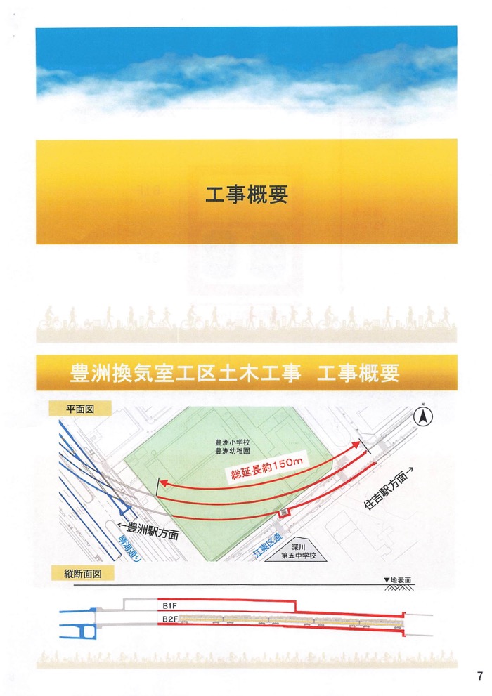 - 今回の説明会は、豊洲小学校の校庭や区道で行う豊洲換気室工区の土木工事