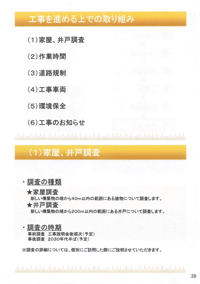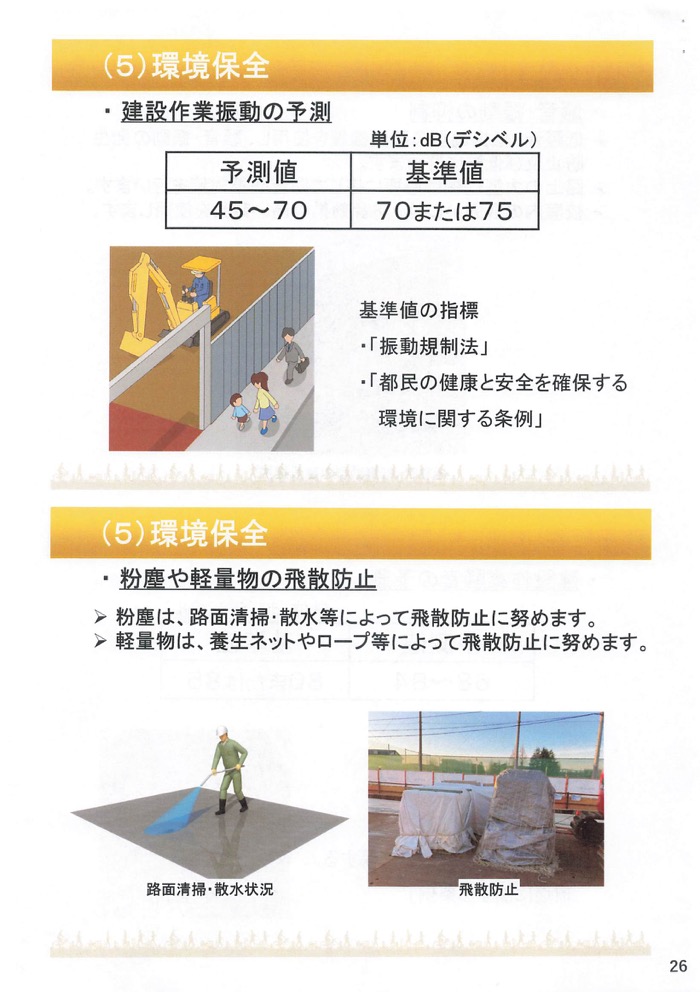- 最大時で、1時間あたり20〜25台のダンプ、30〜40台のミキサー車が通行予定
