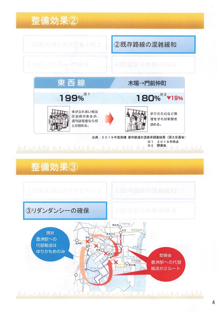 → 特に大江戸線と接続する門前仲町駅で混雑の分散効果を見込めるため。もっともひどい東西線の木場〜門前仲町の混雑率が199%→180%に減る。