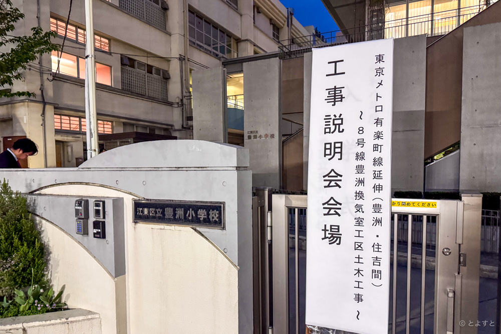 2026年4月17日、東京メトロは有楽町線(地下鉄8号線)の豊洲〜住吉間の延伸について、「豊洲換気室工区土木工事」に関する説明会を豊洲小学校の体育館で実施しました。