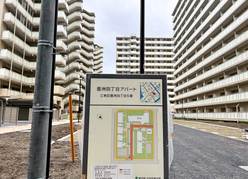 豊洲で建て替えが進められている都営住宅「豊洲四丁目アパート」の現状を見に行ったら、歩道沿いに新しい看板を発見しました!