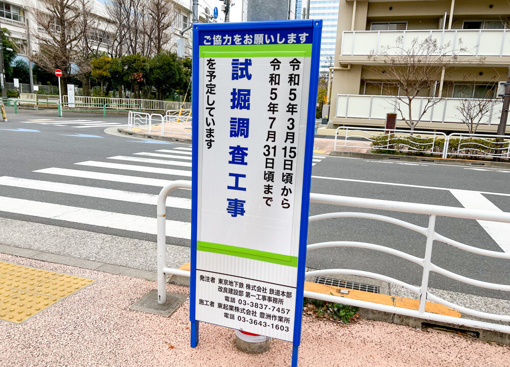 該当箇所へ行ってみると「試掘調査工事」をアナウンスする看板が取り付けられていました!