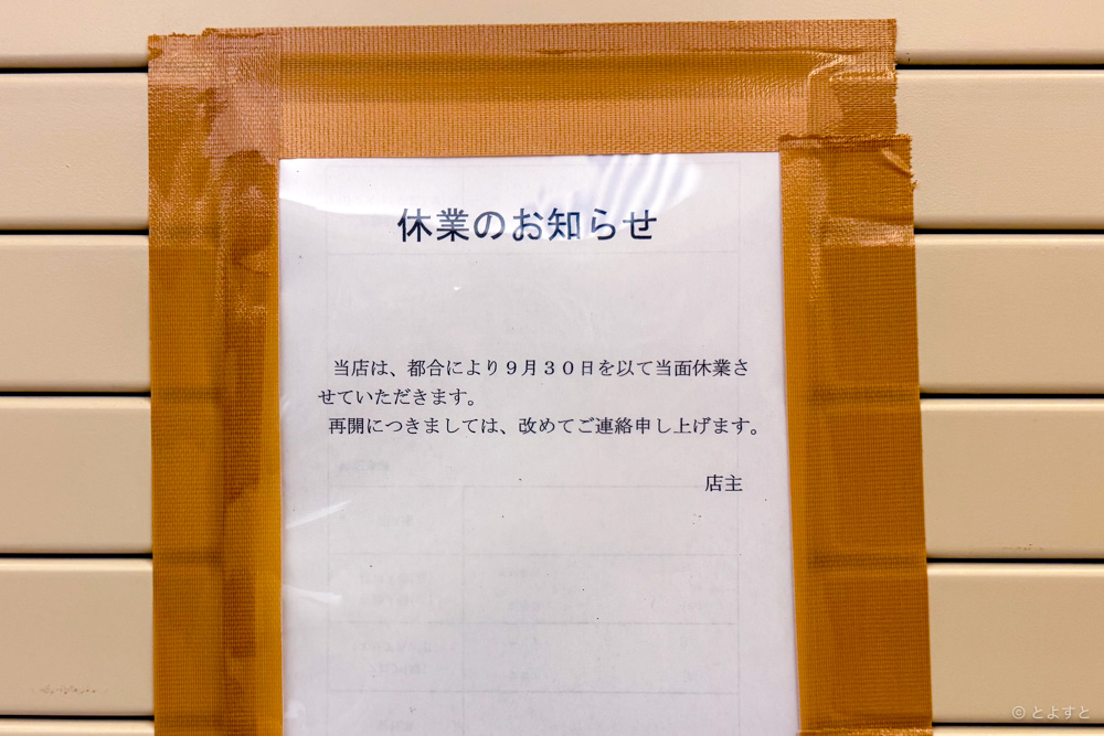 閉店を告げる張り紙はなく、あるのは休業中の張り紙のみ。