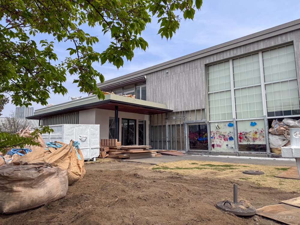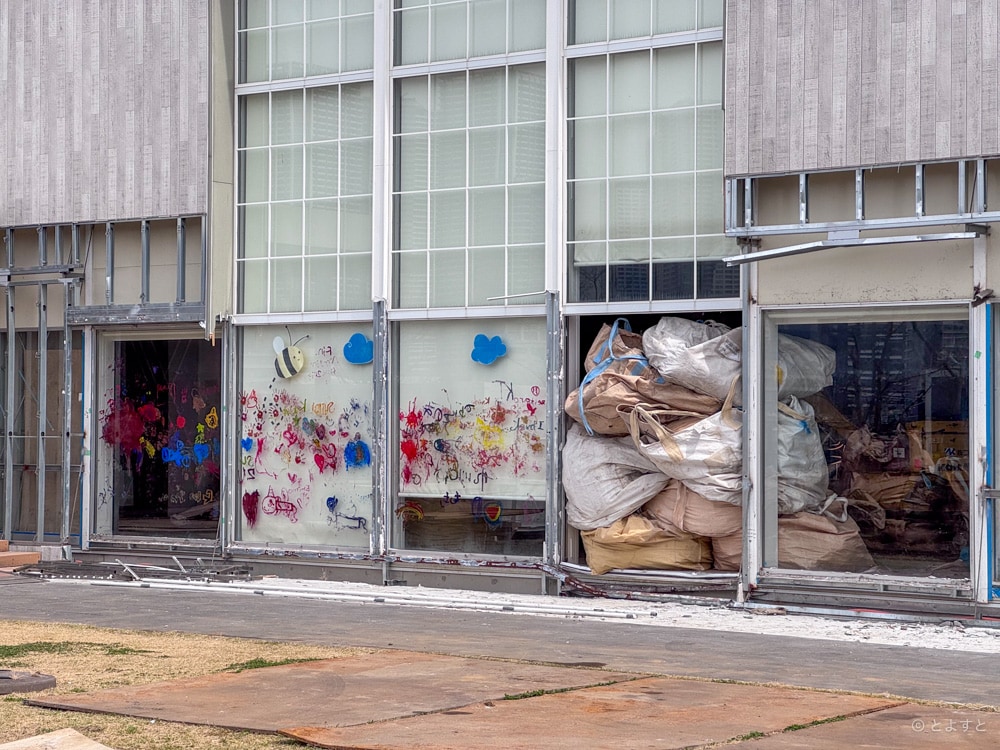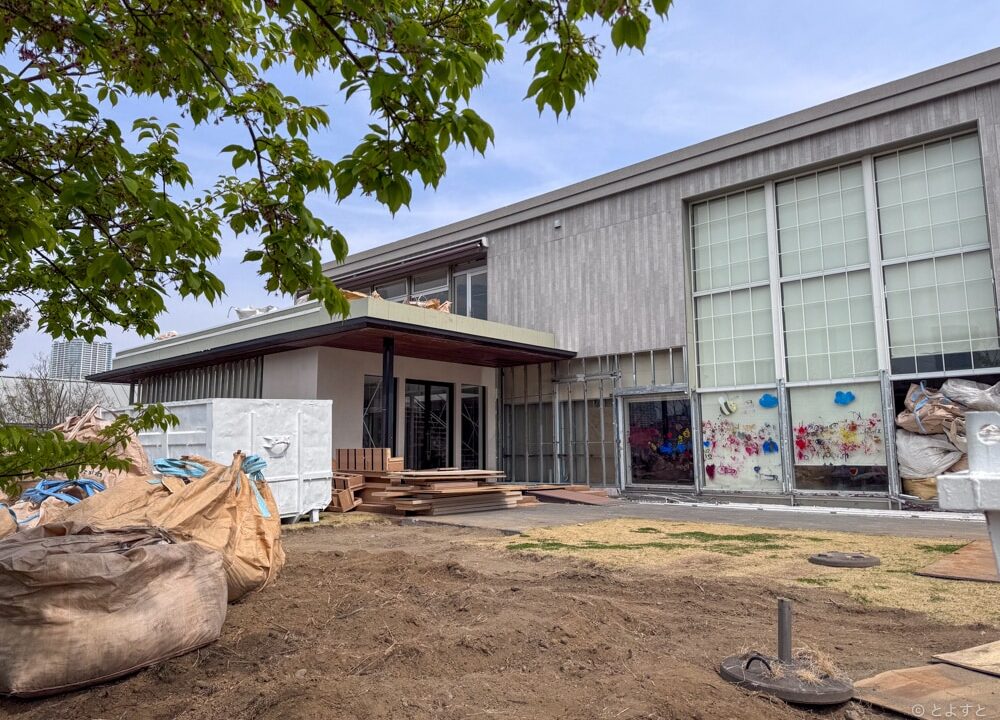 写真は2026年3月22日に撮影した際のようす。外壁の一部が撤去され、芝生も剥がされています。